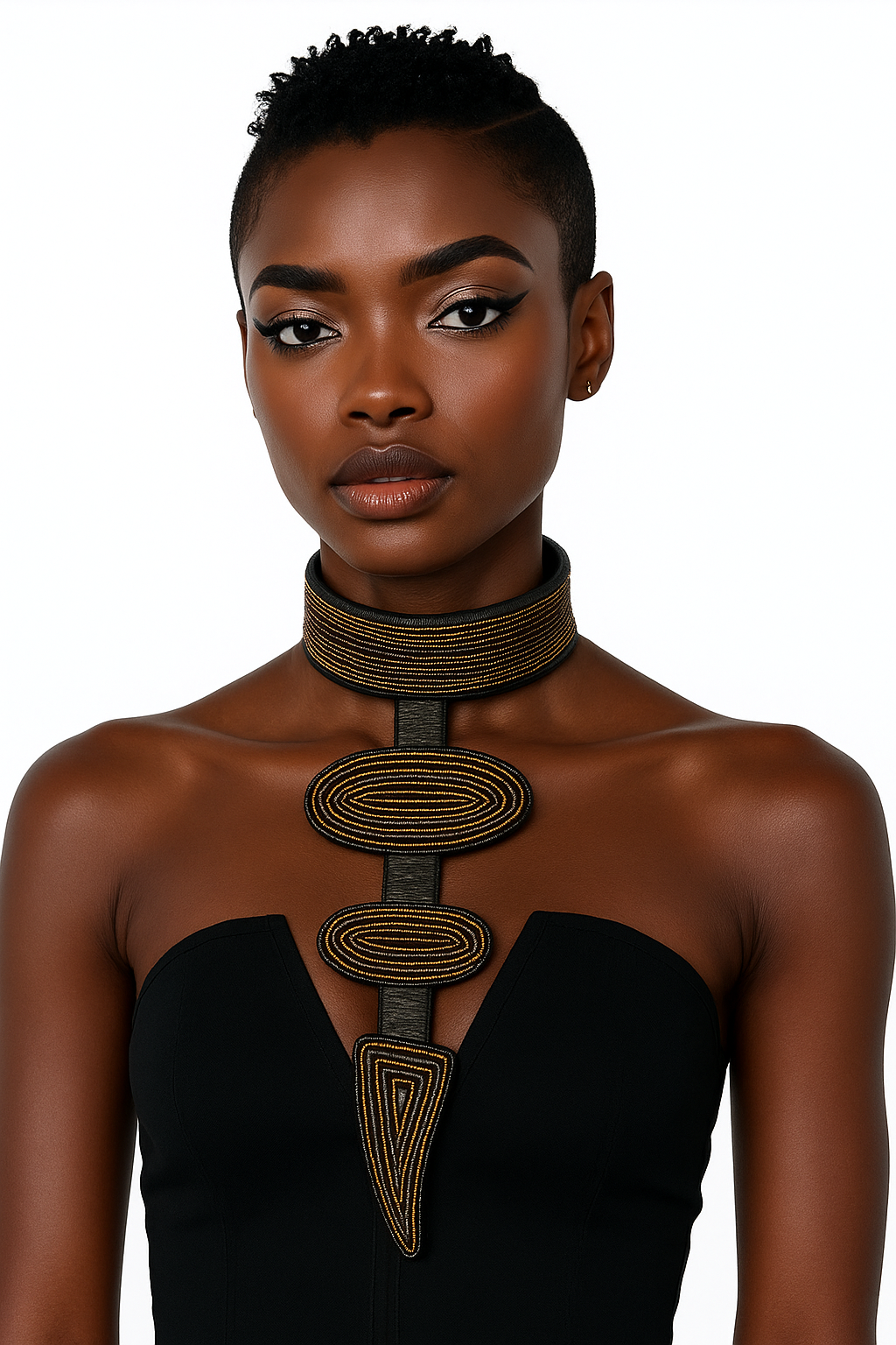 Make an unforgettable impression with this stunning African-inspired statement choker. Handcrafted with precision, this piece features intricate layered oval and triangular designs in shimmering gold and black tones, creating a bold geometric silhouette. The high collar design elegantly elongates the neck, while the cascading centerpiece draws the eye with its unique sculptural form.